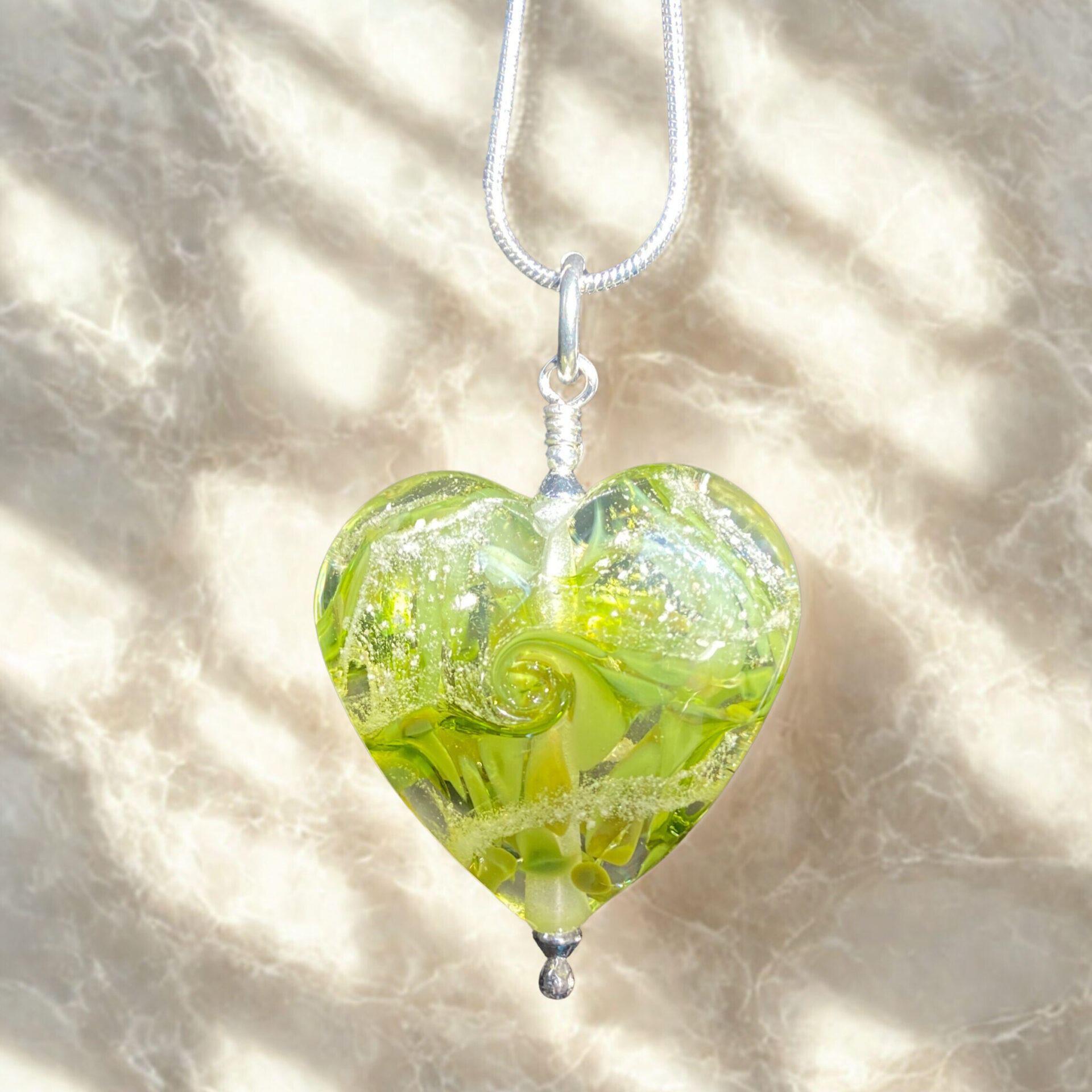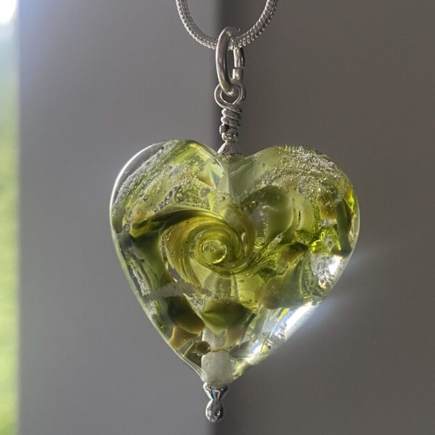 Our Classic Heart Shaped Glass Memorial Bead made in a pretty green apple kinda green. Features a clear glass which allows the ashes to be seen throughout