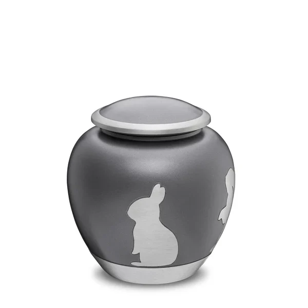 Graceful and symbolic, the Shadow Rabbit Urn embodies serenity and remembrance. Crafted with care, this urn features a soft french grey finish accented by brushed pewter detailing, creating a timeless and elegant look. Delicate rabbit carvings encircle the urn, representing gentleness, renewal, and the enduring bond of love.