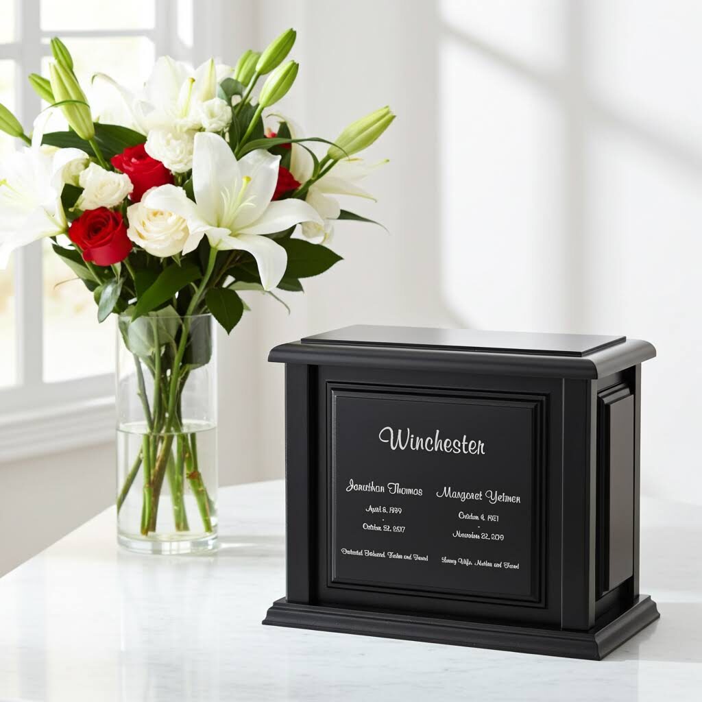 The Winchester Companion Urn has been Handcrafted from solid Walnut Wood and is divided into two compartments to safely enclose the ashes of your loved ones.